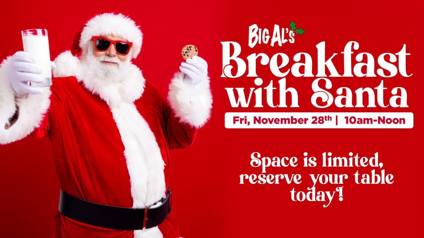 Santa is a super busy guy this time of year. But luckily, he’s a BIG fan of FUN too! To celebrate the season, we’re hosting a special Breakfast with Santa here at Big Al’s Meridian on Friday, November 28th… and YOU and your family are invited! Join us from 10AM-12PM for a delicious holiday-themed buffet filled with all your breakfast favorites, pictures with Santa, a chance to meet Santa’s reindeer, and more fun activities!