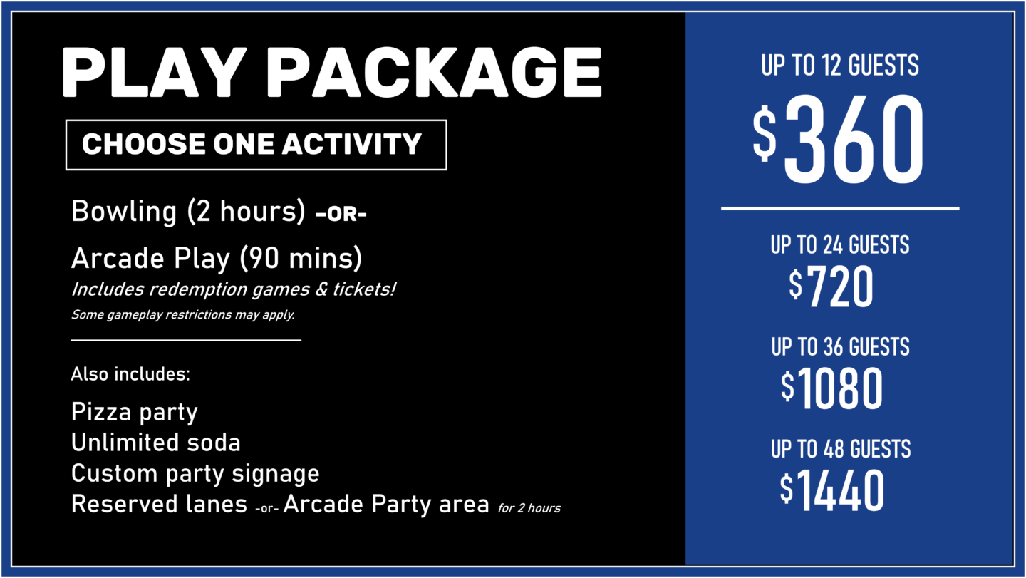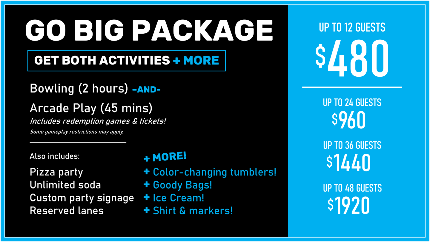 Teen & Kids Parties are a BIG deal here at Big Al’s! And so is the FUN! Whether they want to bowl, play Arcade games, or even do BOTH with our Go BIG Package, we’ve got the perfect options to ensure their celebration is as awesome as they are! Consider your party spot covered.